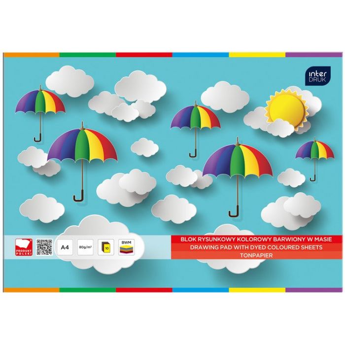 - Blok rysunkowy, zawiera 10 kartek w różnych kolorach.