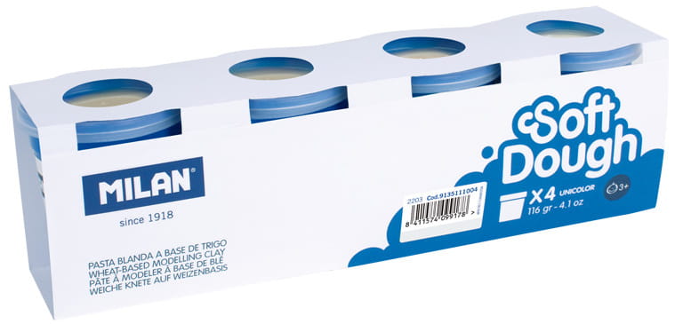 Ciastolina w kolorze białym. Miękka masa plastyczna. Spójna i elastyczna, łatwa do formowania. Nowe kolory można tworzyć łącząc dwa lub więcej kolorów. Nie pozostawia resztek na rękach. Opakowanie zawiera 4 kubeczki w kolorze białym o pojemności 116 g każdy z przezroczystymi pokrywkami. Naturalny skład, bezpieczny dla dzieci. Tylko składniki pochodzenia roślinnego: mąka pszenna, sól, barwnik spożywczy. Zawiera gluten. Zgodna z europejskimi i amerykańskimi normami bezpieczeństwa: ASTM-F963, ASTM-D4236, EN71-1/2/3/9, CPSC.