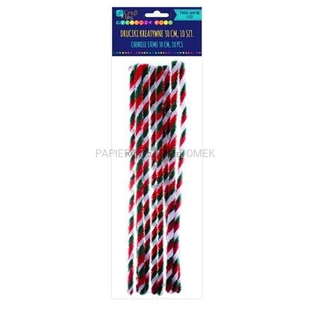 Druciki kreatywne w świątecznych kolorach doskonale nadają się do wszelkiego rodzaju dziecięcej aktywności twórczej. Niezwykle elastyczne, świetnie sprawują się podczas tworzenia zabawnych kształtów i postaci (np. zwierząt). Ilość w opakowaniu: 10 szt.