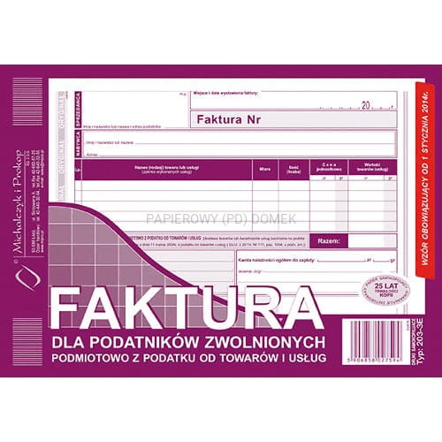 Druk Faktura dla podmiotowo zwolnionych z podatku A5, MiP
