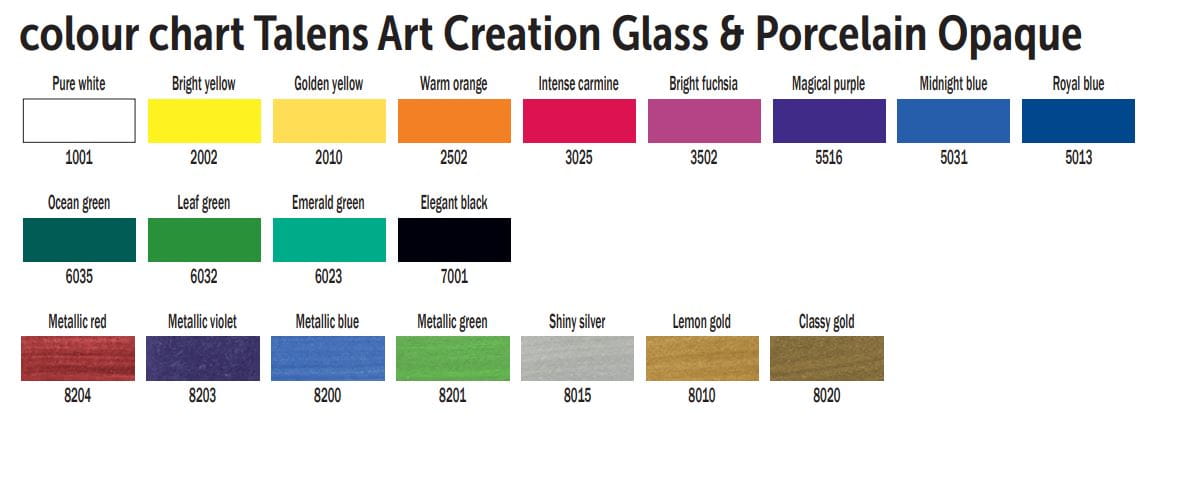 Dekorowanie szkła i porcelany to świetna zabawa i możesz stworzyć najbardziej uderzające i modne dekoracje do swojego domu. Glass & Porcelain Opaque to kryjąca farba do stosowania na szkle, porcelanie i ceramice, dostępna w 20 kolorach. Ponieważ farba nie jest przezroczysta, jest stosowana głównie do porcelany i ceramiki, ale może również nadać Twoim szklanym przedmiotom niezwykłe efekty. Zmień zwykłe szklane i porcelanowe przedmioty i dodaj własne akcenty za pomocą kropek, linii, rysunków i wzorów w żywych kolorach! Wyłącznie do celów dekoracyjnych. Farbę należy nakładać przy użyciu gąbki, płaskiego pędzla lub patyczków do tworzenia kropek. Pozostaw farbę do wyschnięcia na 45 minut i utrwal następnie pracę w piekarniku.