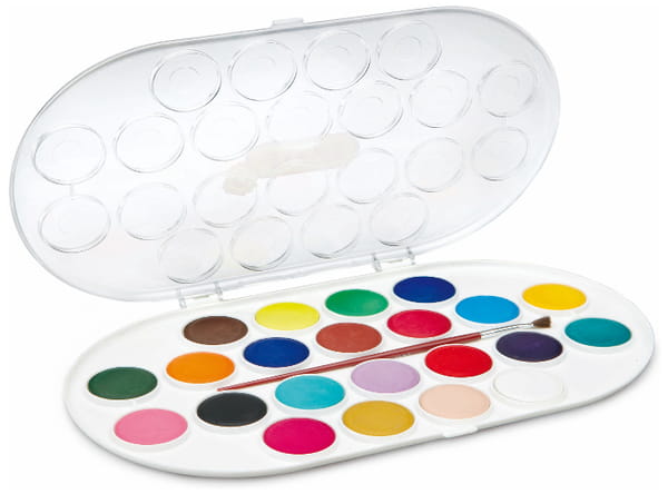 Opakowanie zawiera 22 krążków(30mm) farb akwareli, w różnych kolorach, na plastikowej tacce.