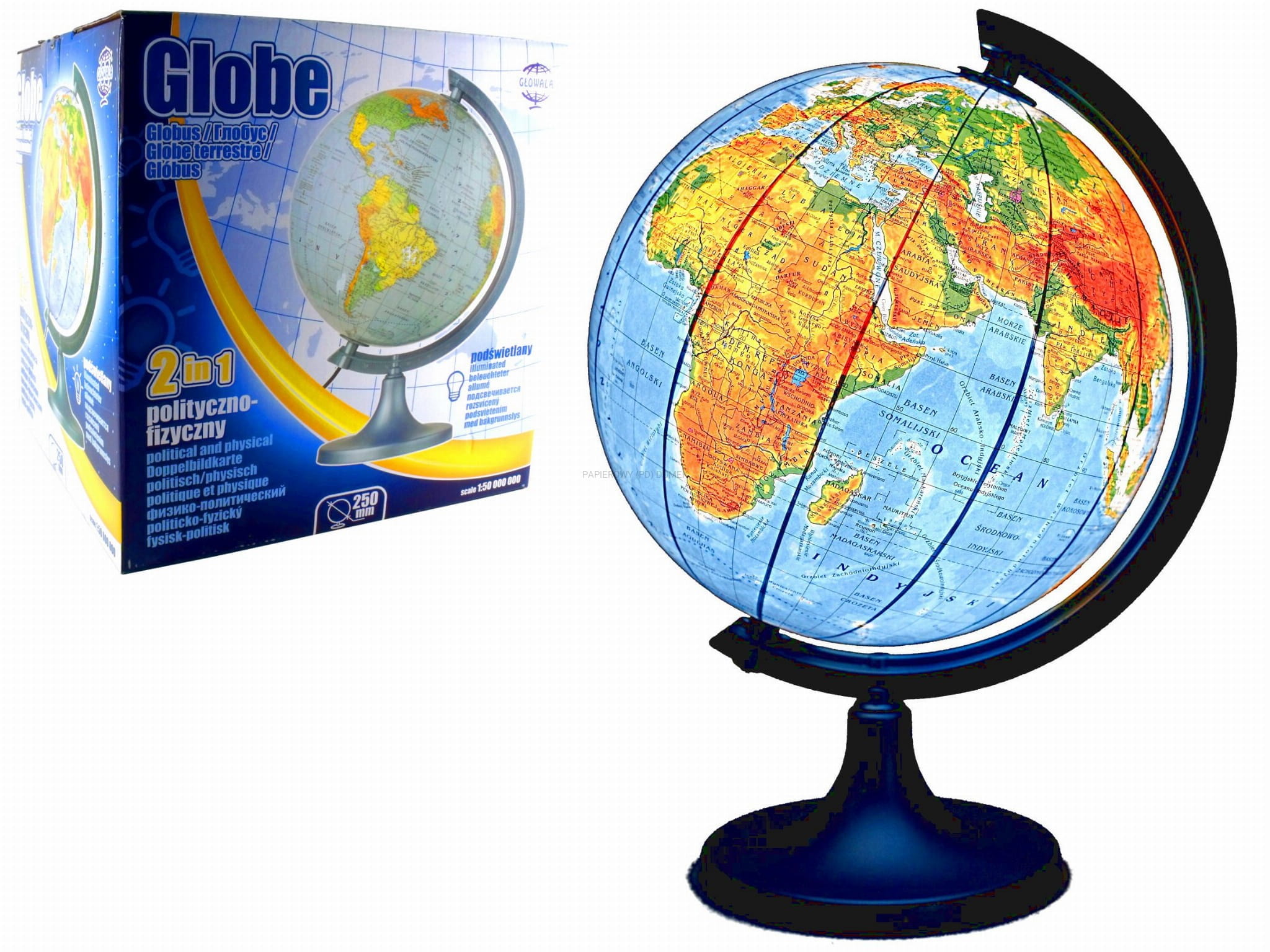 - Jest to globus zawierający mapę polityczną Świata, natomiast po podświetleniu pojawia się mapa fizyczna.