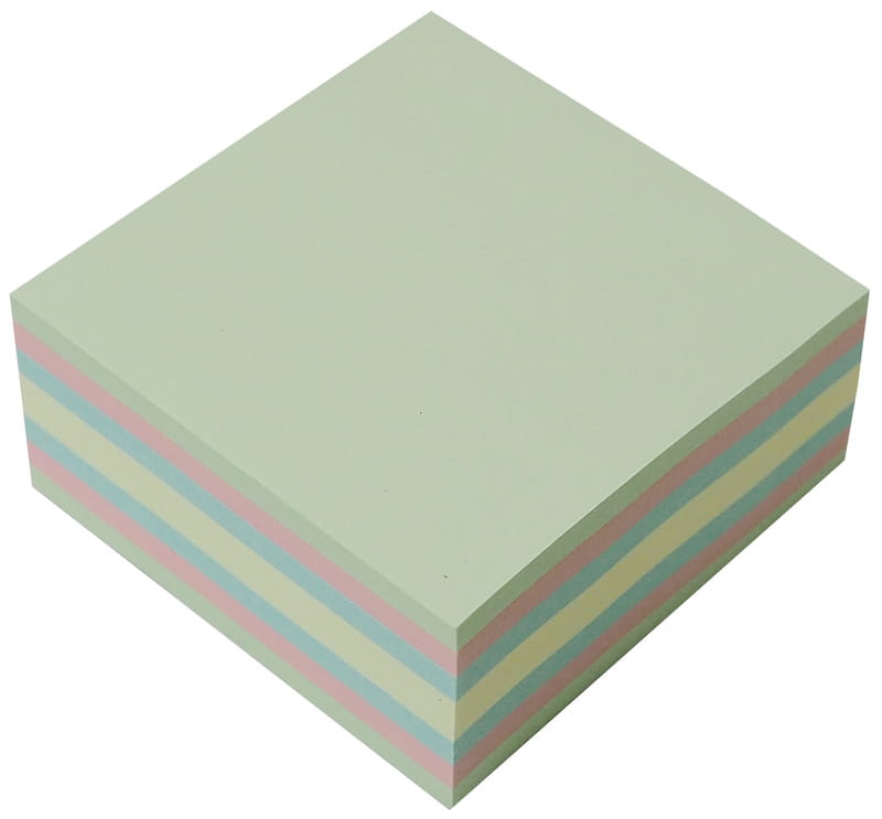 Notes kostka o wymiarach 76 x 76 mm zawiera 400 kartek w 4 pastelowych kolorach: zielonym, różowym, niebieskim i żółtym. Każda kostka ofoliowana w celu zabezpieczenia przed uszkodzeniem i pobrudzeniem .