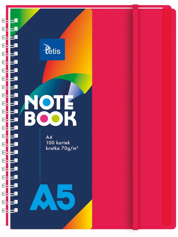 Kołozeszyt A5 w plastikowej okładce 100 kartek kratka czerwony na gumkę, Tetis