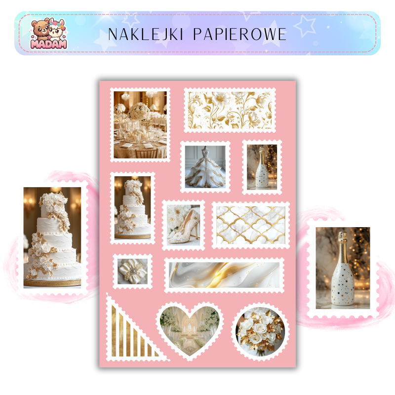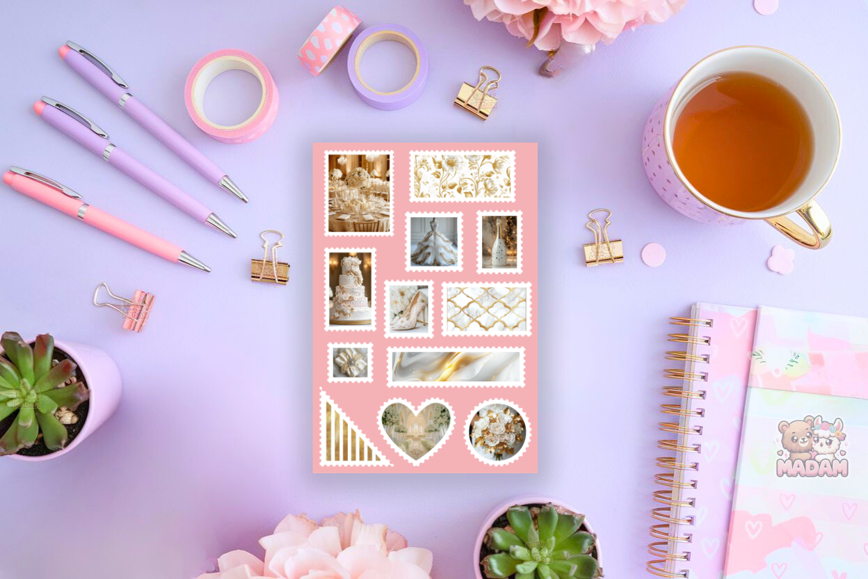 Naklejki znaczki pocztowe białe i złote ślubne marki MaDam Creative to arkusz 13 × 19 cm pełen unikalnych ilustracji. Sprawdzą się w bullet journali, plannerach, scrapbookingu, kartkach i albumach. Wykonane z wysokiej jakości papieru matowego, posiadają mocny klej, który osiąga pełną przyczepność po 24 h.