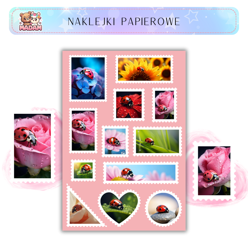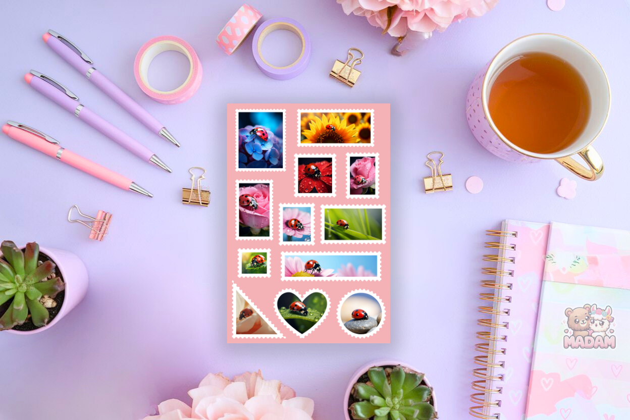Naklejki znaczki pocztowe biedronki marki MaDam Creative to arkusz 13 × 19 cm pełen unikalnych ilustracji. Sprawdzą się w bullet journali, plannerach, scrapbookingu, kartkach i albumach. Wykonane z wysokiej jakości papieru matowego, posiadają mocny klej, który osiąga pełną przyczepność po 24 h.