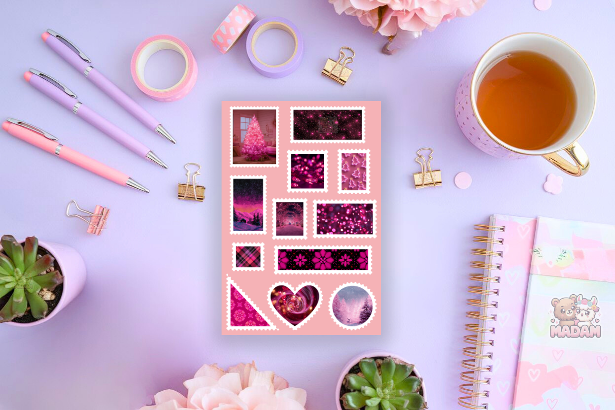 Naklejki znaczki pocztowe Neonowy róż Święta Boże Narodzenie marki MaDam Creative to arkusz 13 × 19 cm pełen unikalnych ilustracji. Sprawdzą się w bullet journali, plannerach, scrapbookingu, kartkach i albumach. Wykonane z wysokiej jakości papieru matowego, posiadają mocny klej, który osiąga pełną przyczepność po 24 h.