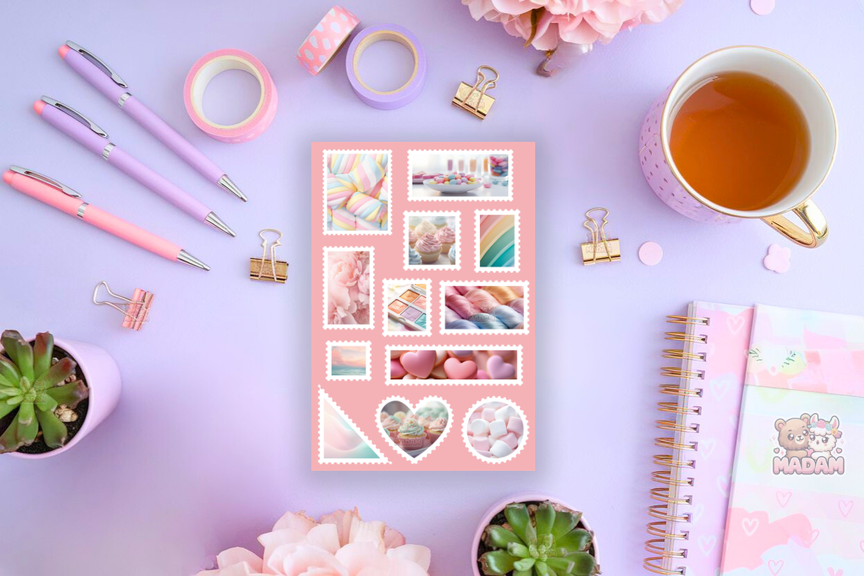 Naklejki znaczki pocztowe Pastelowe Kolory marki MaDam Creative to arkusz 13 × 19 cm pełen unikalnych ilustracji. Sprawdzą się w bullet journali, plannerach, scrapbookingu, kartkach i albumach. Wykonane z wysokiej jakości papieru matowego, posiadają mocny klej, który osiąga pełną przyczepność po 24 h.