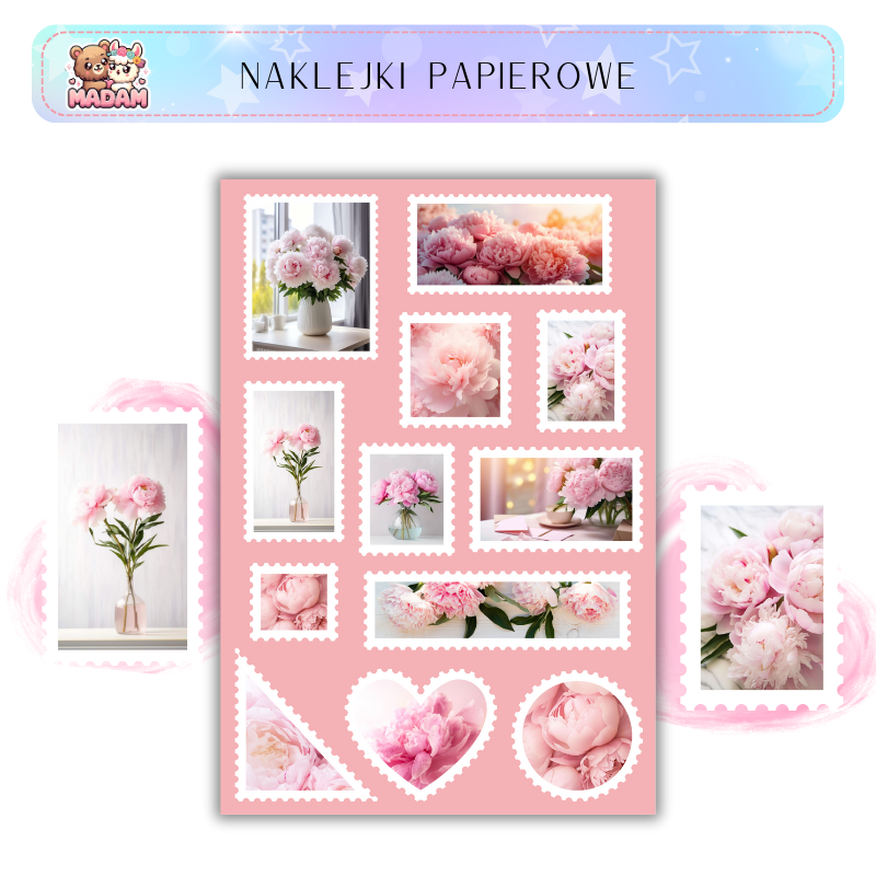 Naklejki znaczki pocztowe Piwonie marki MaDam Creative to arkusz 13 × 19 cm pełen unikalnych ilustracji. Sprawdzą się w bullet journali, plannerach, scrapbookingu, kartkach i albumach. Wykonane z wysokiej jakości papieru matowego, posiadają mocny klej, który osiąga pełną przyczepność po 24 h.