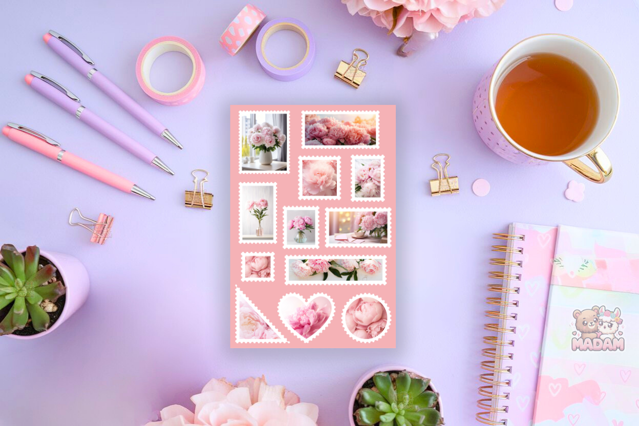 Naklejki Znaczki Pocztowe Piwonie (Peonies) Bullet Journal Scrapbooking - MaDam Creative