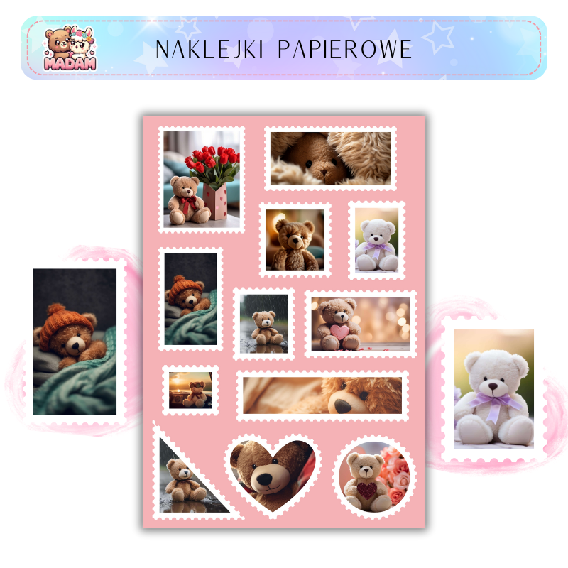 Naklejki znaczki pocztowe Pluszowe Misie Teddy Bears 2 marki MaDam Creative to arkusz 13 × 19 cm pełen unikalnych ilustracji. Sprawdzą się w bullet journali, plannerach, scrapbookingu, kartkach i albumach. Wykonane z wysokiej jakości papieru matowego, posiadają mocny klej, który osiąga pełną przyczepność po 24 h.