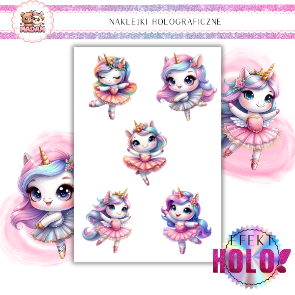 Naklejki foliowe Holograficzne Jednorożce Baletnice z wodoodpornym klejem 5 sztuk 6 cm, MaDam