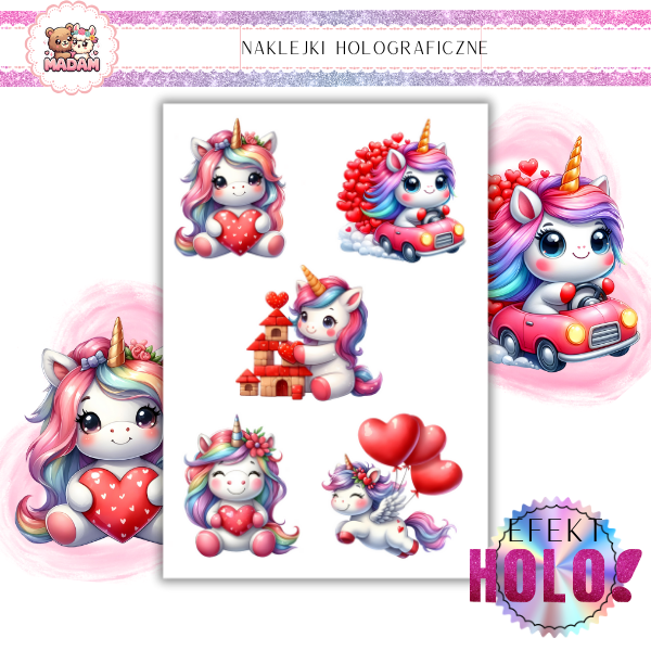 Naklejki foliowe Holograficzne Jednorożce Serca z wodoodpornym klejem 5 sztuk 6 cm, MaDam