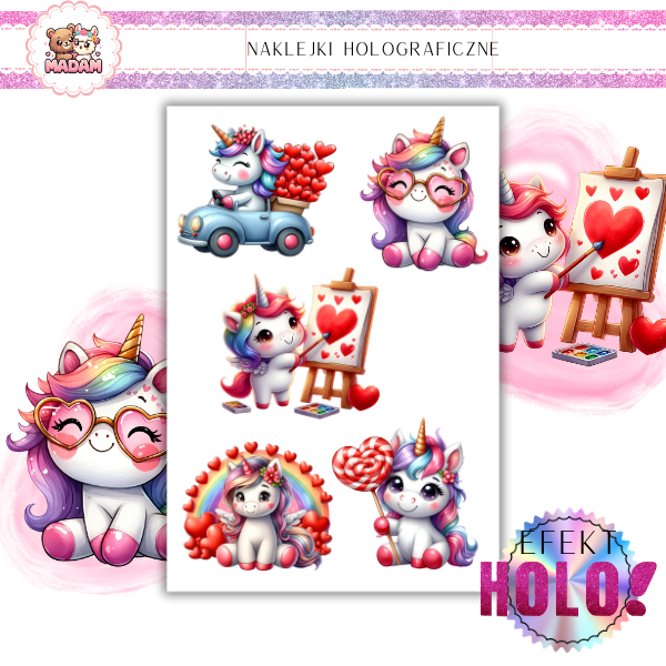Naklejki foliowe Holograficzne Jednorożce Serca z wodoodpornym klejem 5 sztuk 6 cm, MaDam