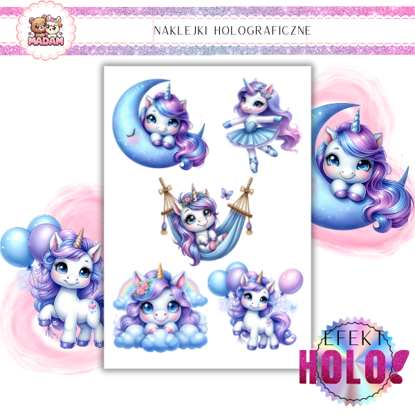 Naklejki foliowe Holograficzne Jednorożce Unicorn z wodoodpornym klejem 5 sztuk 6 cm, MaDam