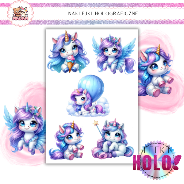 Naklejki foliowe Holograficzne Jednorożce z wodoodpornym klejem 5 sztuk 6 cm, MaDam
