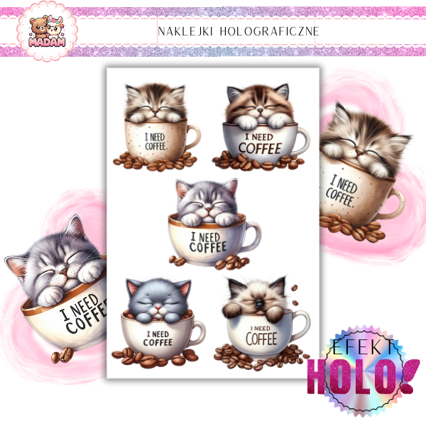 Naklejki foliowe Holograficzne Kot Kawa z wodoodpornym klejem 5 sztuk 6 cm, MaDam