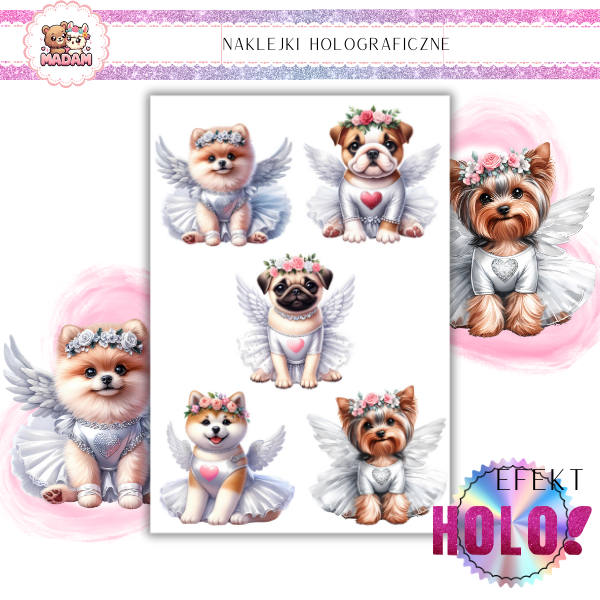 Naklejki foliowe Holograficzne Psy Anioły z wodoodpornym klejem 5 sztuk 6 cm, MaDam