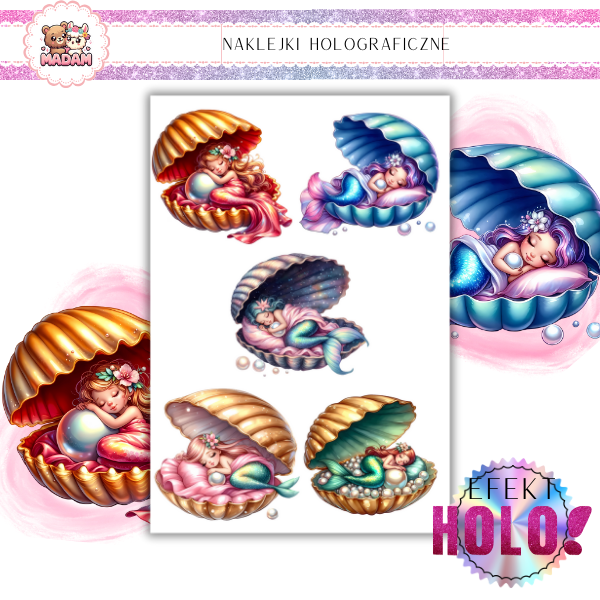 Naklejki foliowe Holograficzne Syrenki Muszle z wodoodpornym klejem 5 sztuk 6 cm, MaDam