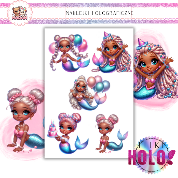 Naklejki foliowe Holograficzne Syrenki z wodoodpornym klejem 5 sztuk 6 cm, MaDam