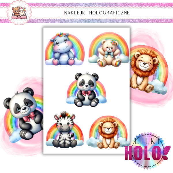 Naklejki foliowe Holograficzne Zwierzaki Safari z wodoodpornym klejem 5 sztuk 6 cm, MaDam