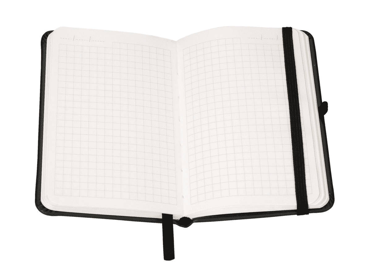pionowa gumka zamykająca gumka na długopis zaokrąglone rogi wyklejka z czarnego papieru ozdobnego wnętrze: kratka koperta na luźne karteczki wstążka w kolorze okładki