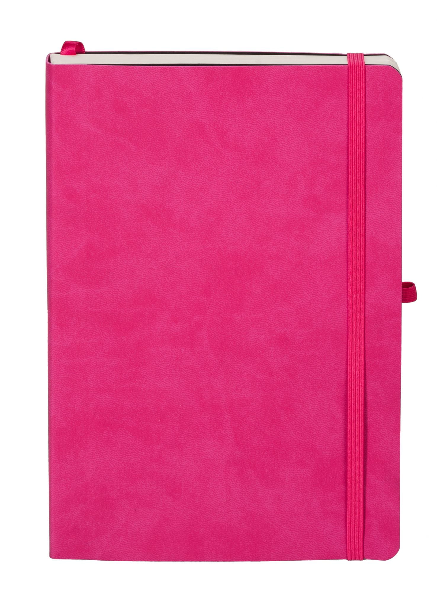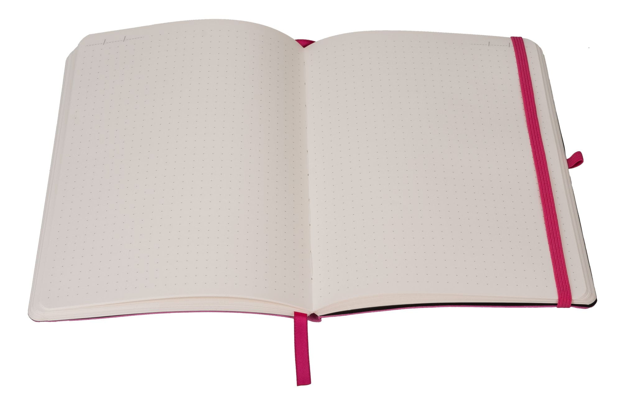 pionowa gumka zamykająca gumka na długopis zaokrąglone rogi wyklejka z czarnego papieru ozdobnego wnętrze: kropki koperta na luźne karteczki wstążka w kolorze okładki