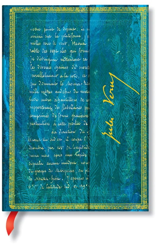 Jules Verne (1828–1905) jest autorem kilku najsłynniejszych książek na świecie. Ten zdobiony manuskrypt w kolorze oceanicznego błękitu zawiera stronę z odręcznego szkicu książki Verne'a „ Dwadzieścia tysięcy mil podmorskiej żeglugi”. Tylna okładka przedstawia rycinę przedstawiającą kapitana Nemo obserwującego „kałamarnicę kolosalnych rozmiarów”.