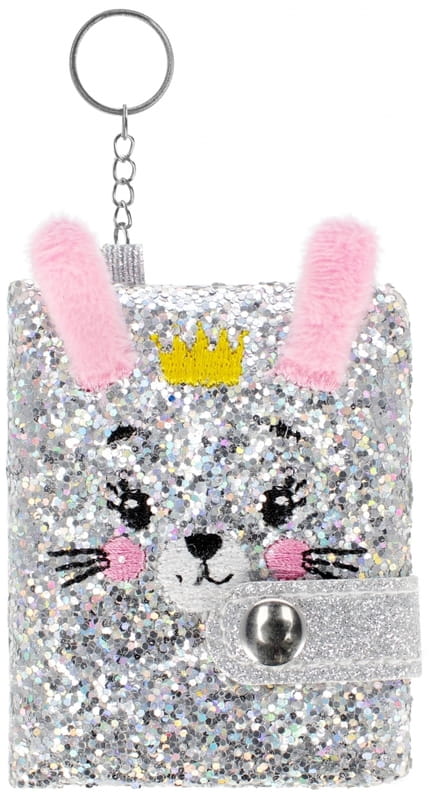 Notes brokatowy z brelokiem z wizerunkiem królika z gładkimi kartkami. Notes jest pokryty brokatem oraz przyjazną grafiką z króliczkiem. Posiada zapięcie na zatrzask. Idealny pomysł na prezent dla najmłodszych a także doskonały dodatek na notatki, rysunki, sekretne zapiski. Wymiary produktu 8x6x2 cm. Notes pakowany w woreczek z zawieszką. Przeznaczony dla dzieci w wieku: 3+.