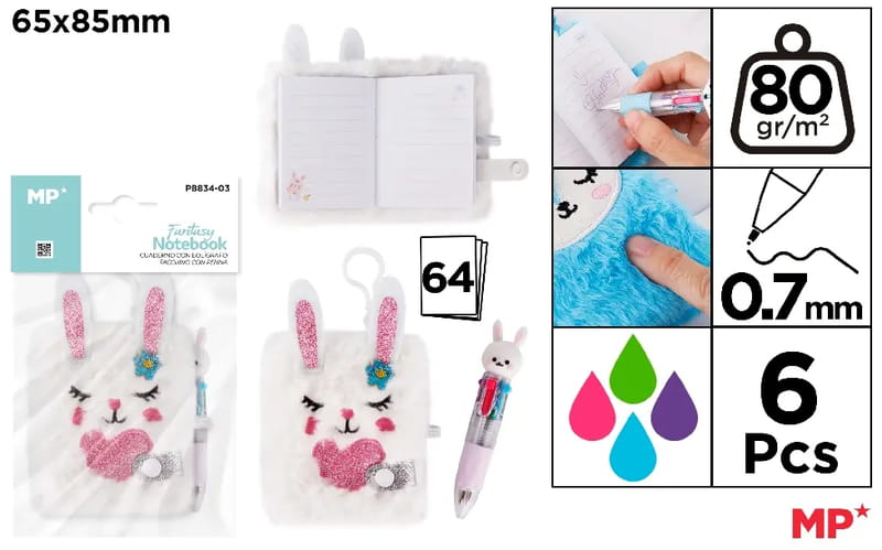 Notes pluszowy z kolorowym długopisem mini 4w1 0,7mm, Królik, Main Paper