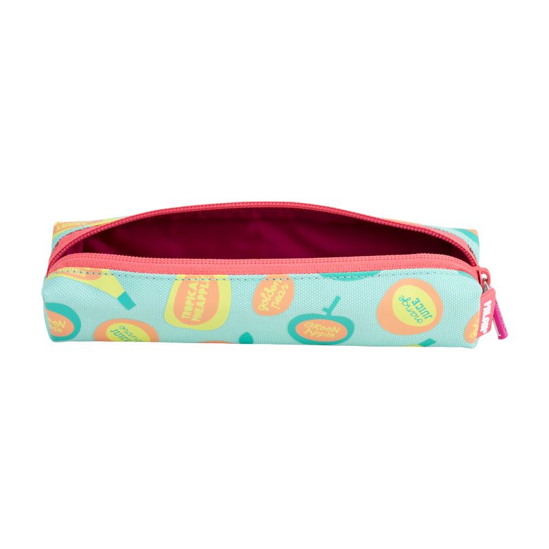 Piórnik mini kwadratowy zapinany na suwak. Kolekcja FRUTIKIS to zabawna sałatka owocowa w świeżych i tropikalnych kolorach. Rozmiar: 20,5 x 4,5 x 5 cm. Materiał wierzchni i podszewka 100% poliester.
