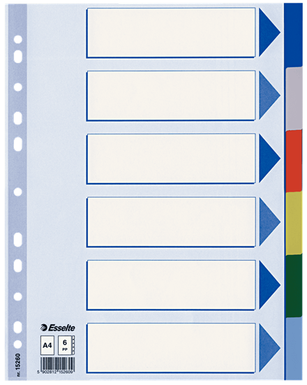 Przekładki do segregatora A4 6 kart, plastikowe z kolorowym indeksem, Esselte