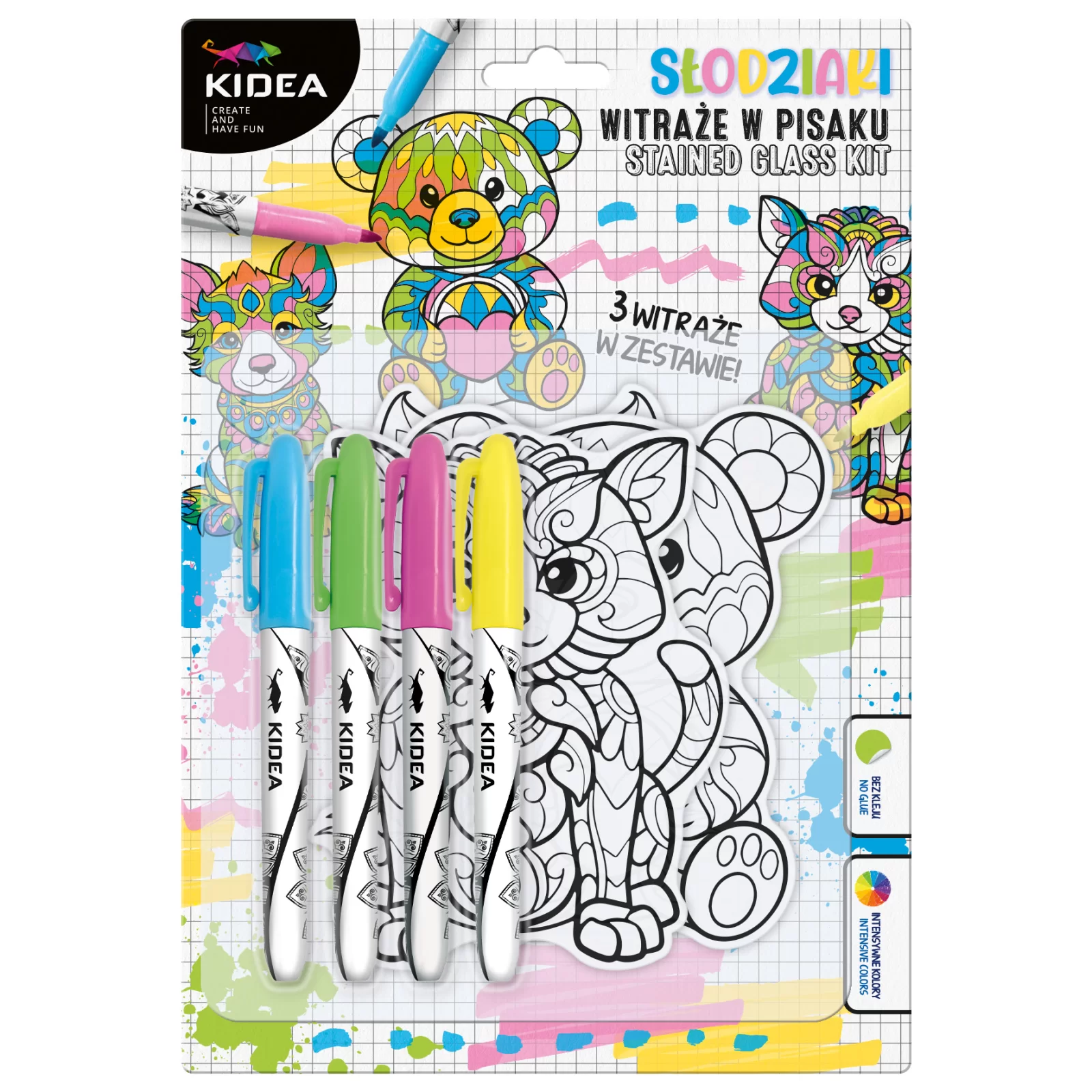 Witraże na okno z pisakami. Adhezyjne naklejki bez użycia kleju utrzymują się na powierzchni dzięki działaniu sił elektrostatycznych. Bez problemu można przyklejać je i odklejać bez niszczenia okna lub ściany. W opakowaniu znajdują się trzy witraże: miś, wilczek i kotek oraz cztery pisaki w intensywnych kolorach: zielonym, żółtym, różowym i niebieskim. Umieszczając witraże na oknie uzyskamy niezwykły efekt kolorowych promieni słonecznych wypełniających pomieszczenie. Witraże na okno to nie tylko piękna dekoracja pokoju dziecięcego, ale również wyjątkowy prezent dla bliskiej osoby.