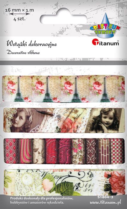 zestaw wstążek materiałowych - 4 kolory z nadrukiem - szerokość wstążki: 16 mm - długość każdej wstążki: 1 m - wzory: vintage fotografie, kwiaty, ornamenty