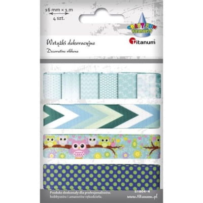 zestaw wstążek materiałowych - 4 kolory z nadrukiem - szerokość wstążki: 16 mm - długość każdej wstążki: 1 m - wzory: sowy, wzory geometryczne