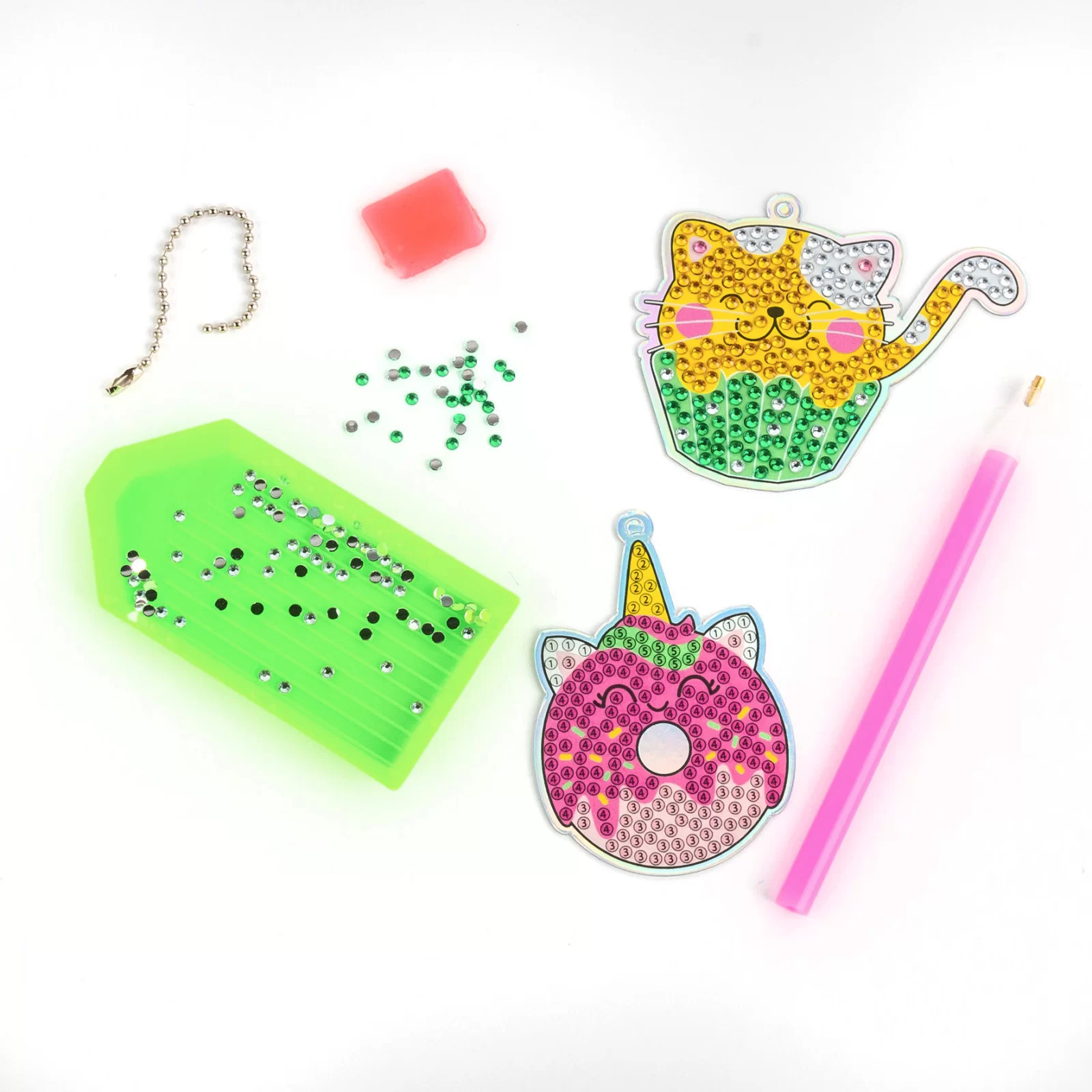 Dodaj trochę blasku do swojego looku z diamentowymi zawieszkami Kidea. Podążaj za cyframi i stwórz swoją unikalną zawieszkę słodkiego zwierzątka ozdobioną pięcioma kolorami diamencików: srebrnym, ciemnym różowym, jasnym różowym, złotym i zielonym. Gotową dekorację możesz użyć jako naszyjnik, breloczek do kluczy bądź dodatek do plecaka i piórnika.