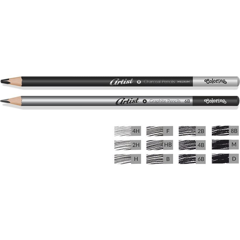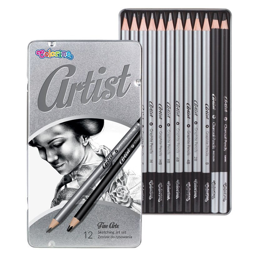 - Zestaw zawiera: ołówki grafitowe w 10 stopniach twardości oraz węgiel w 2 stopniach