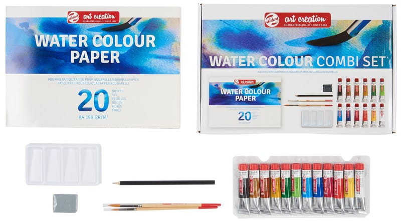 Ten wyszukany zestaw to najlepszy zestaw startowy dla tych, którzy chcą rozpocząć swoją przygodę z malowaniem akwarelami! Zestaw zawiera wszystko, czego potrzebujesz, aby zacząć: zestaw akwareli w tubkach 12 x 12 ml w podstawowych kolorach do zbudowania palety, podkładkę z papieru akwarelowego, 2 pędzle akwarelowe, poręczną tackę do mieszania, ołówek i gumkę do mazania.